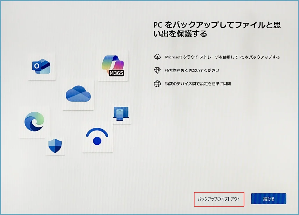 Windows11 を使用していると突然「PCをバックアップしてファイルと想い出を保護する」という全画面メッセージが表示されることがあります。