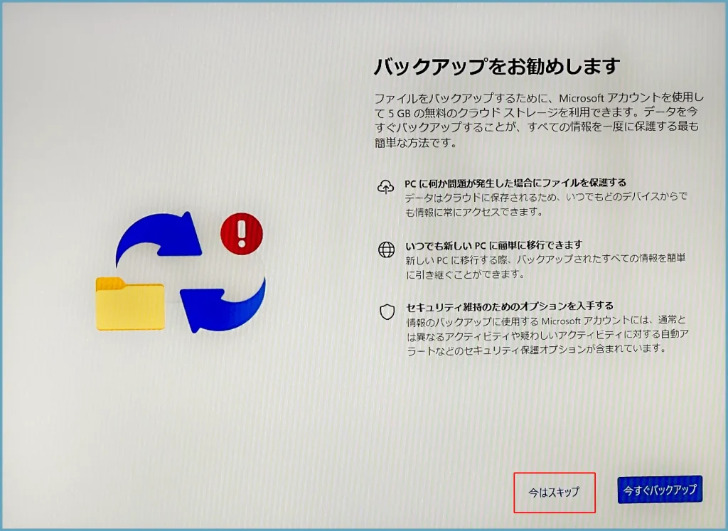 このような予期せぬトラブルに合わないためにも、「PCをバックアップしてファイルと想い出を保護する」、「今すぐバックアップしましょう」、「ファイルをバックアップしましょう」という全画面表示は先に進めず拒否することをおすすめします。