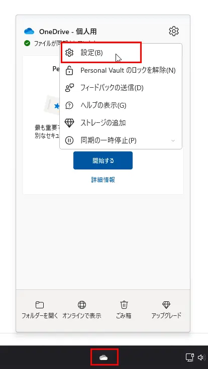 タスクバーの通知領域(タスクトレイ)のOneDriveアイコン(雲のマーク)を右クリックして、表示されるメニューから[設定]をクリックします。