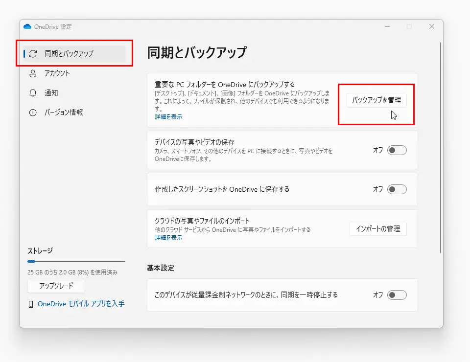 OneDriveの設定画面から[同期とバックアップ] → [バックアップを管理]をクリックします。
