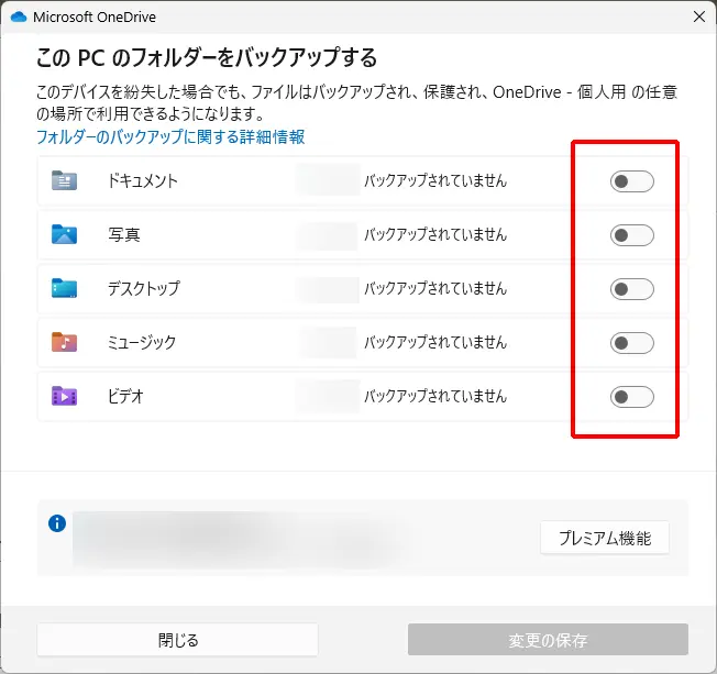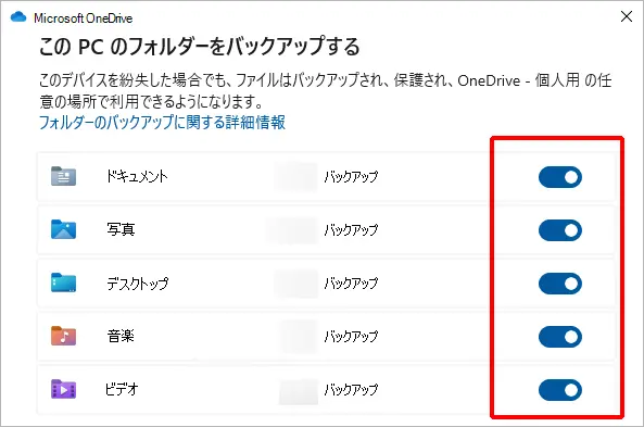 バックアップ設定がされているフォルダは、スイッチが有効になっています。