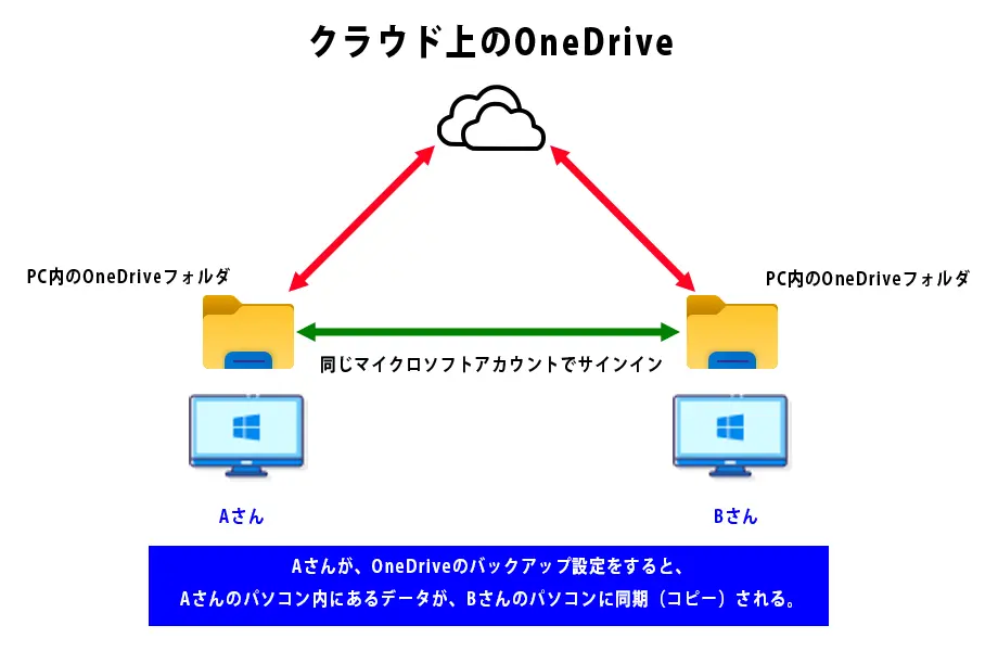 下の図のように、Aさんのパソコンの中のデータは、知らない間に同期されてBさんのパソコンから閲覧や編集ができる状態になってしまいます。