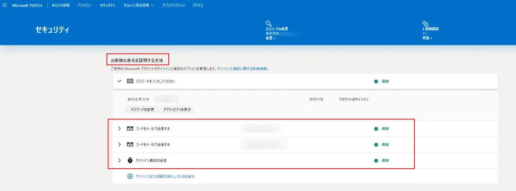 また、ここで登録した内容はパスワード紛失や、サインインできなくなった際の復旧手段として使用しますので状態が「最新」になっていることを確認してください。