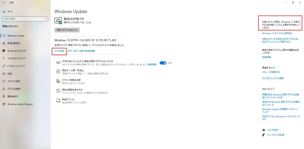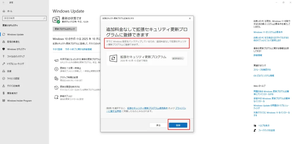 「2026年10月13日まで、延長セキュリティ更新プログラムに登録されています」と、何の問題もなく表示されました。