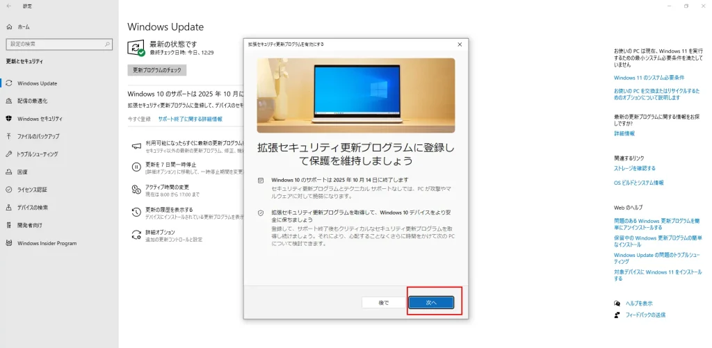 「拡張セキュリティ更新プラグラムに登録して保護を維持しましょう」の画面がポップアップしてきたので[次へ]ボタンをクリックします。