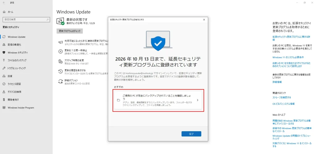 本来は、上の画面で[完了]ボタンをクリックすればESU登録設定は終わりなのですが、「Windows バックアップ」の設定を確認するために、「ご使用のPCが完全にバックアップされていることを確認しましょう」の部分をクリックしてみました。