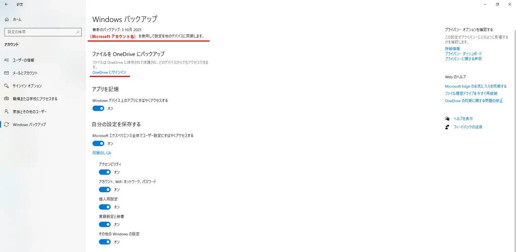 なお、この画面は、[スタートボタン] → [設定(歯車マーク)] →[アカウント] → [Windows バックアップ]からも確認することができます。