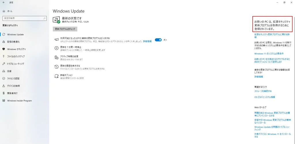 「お使いのPCは、拡張セキュリティ更新プログラムを取得するために登録されています。」と表示されているのでESUに登録済みだということが確認できます。