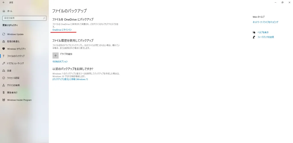 「ファイルのバックアップ」の画面でも、「OneDriveにサインイン」のリンクがあるので、OneDriveにサインインしていないことがわかります。