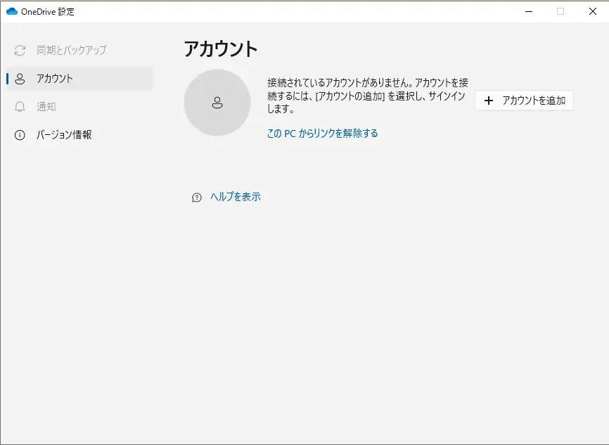 アカウントは何も登録されておらず、OneDriveにサインインしていないことが確認できました。