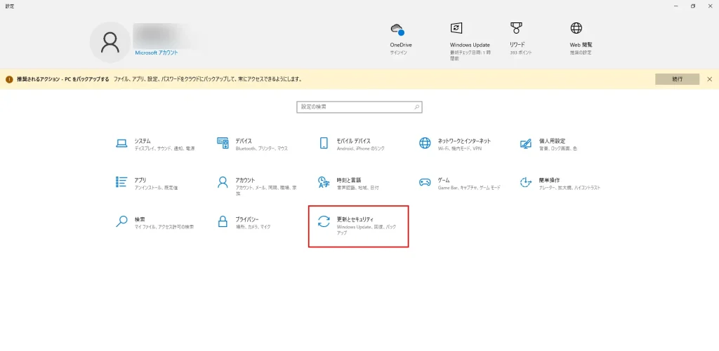 [スタートボタン] → [設定(歯車マーク)] →[更新とセキュリティ]を開きます。