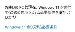 なお、「お使いのPCは現在、Windows 11 を実行するための最小システム必要条件を満たしていません」の表示があることから、このパソコンがWindows 11に対応していないことも確認できます。